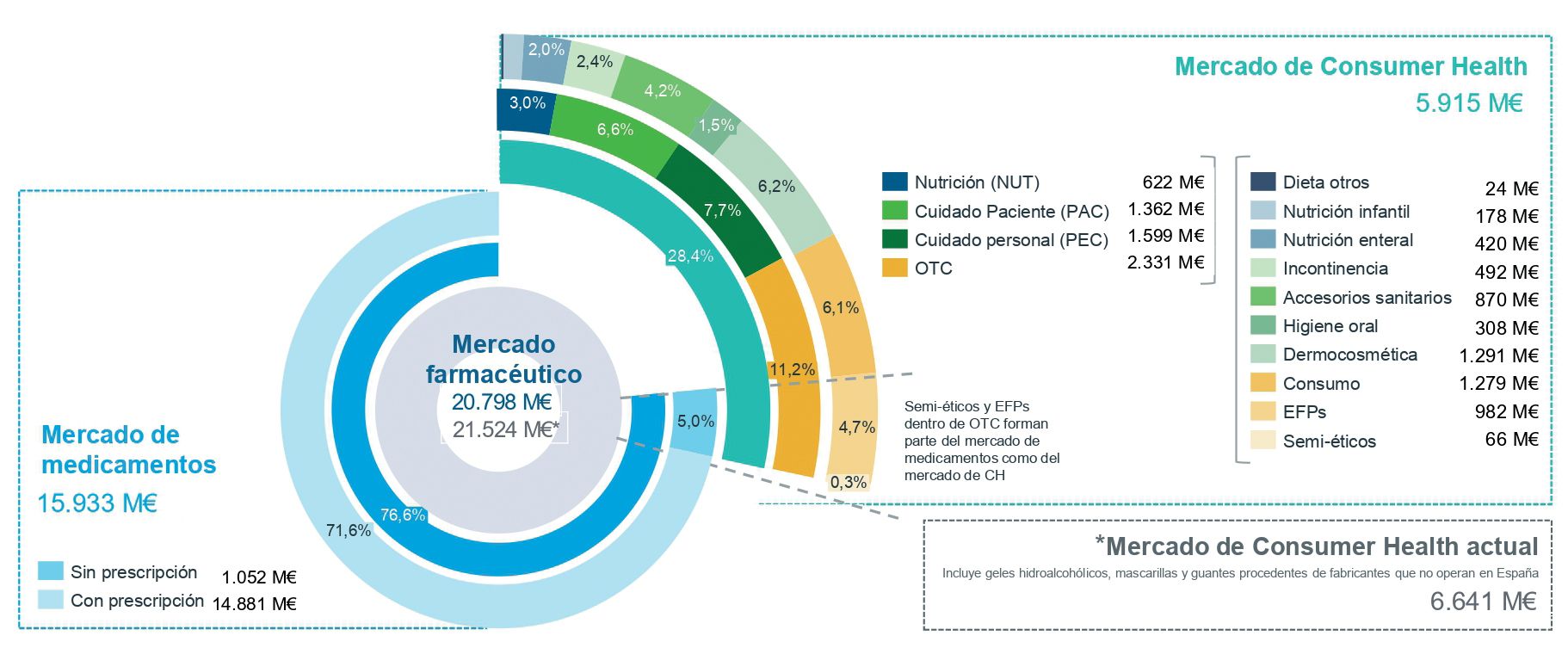 Este conocimiento del medicamento no es un aspecto menor, pues el ámbito de actuación del sector del autocuidado no solo son los medicamentos no sujetos a prescripción médica, sino que también cubre todas las áreas de medicamentos y productos para dar calidad de vida a las personas: «Cuando nos referimos al mercado del autocuidado hablamos de medicamentos y productos de las categorías OTC (Over The Counter), PEC (productos para el cuidado personal), PAC (productos para el cuidado del paciente) y NUT (productos de nutrición), es decir, de medicamentos y de productos sanitarios no sujetos a prescripción médica, de complementos alimenticios y de cosméticos», aclara Jaume Pey, director general de la Asociación para el Autocuidado de la Salud (anefp). A esta amalgama de sectores que conforman el mercado del autocuidado se la denomina también habitualmente Consumer Health (figura 1).