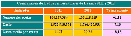 El acumulado del gasto en recetas en los meses de enero y febrero de 2012 en comparación con los mismos meses del año anterior aparecen en la siguiente tabla en la que se muestra un incremento del +1,5% en el número de recetas, un descenso del gasto de -7,10% y un descenso del gasto medio por receta del -8,15%.