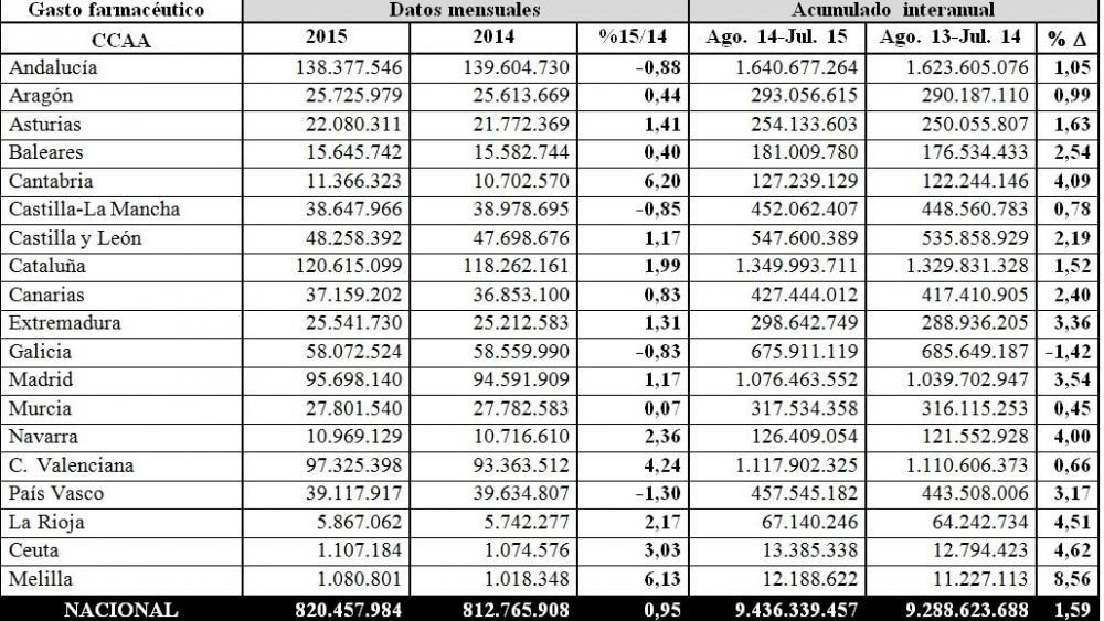 El gasto farmacéutico aumentó en julio un 0,95% respecto al mismo mes de 2014