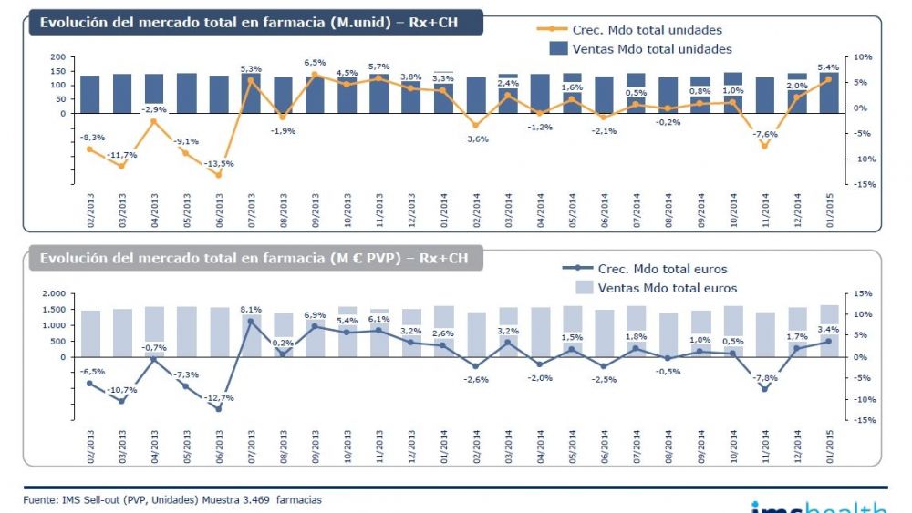 IMS Health ha actualizado su informe sobre la evolución del mercado de la farmacia española con datos que muestran que en enero de 2015 crece un 5,4% en unidades y un 3,4% en valores respecto al mismo mes del año anterior.