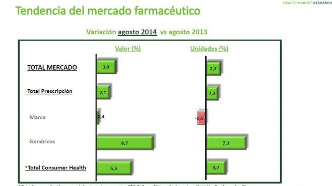 En este sentido, según datos de la compañía de estudios de mercado hmR-Health Market Research España, el incremento del mercado en el mes de agosto ha estado marcado por el crecimiento del mercado de genéricos (7,3% y 8,7% en unidades y valor, respectivamente) y de consumer health (3,7% y 5,5% en unidades y valor, respectivamente) con respecto al mes de agosto de 2013.