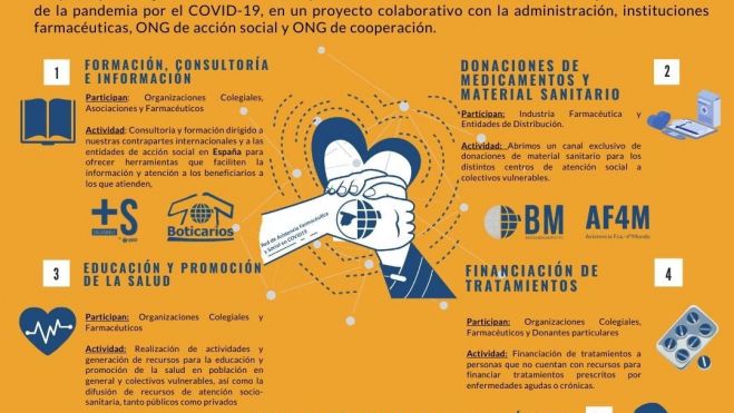 En el marco de la emergencia sanitaria provocada por el COVID-19, Farmacéuticos Sin Fronteras de España (FSFE) ha puesto en marcha un proyecto colaborativo para ofrecer asistencia farmacéutica y social a los colectivos más vulnerables que son los que más especialmente están sufriendo las consecuencias de esta crisis en su salud.