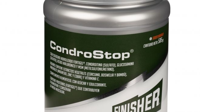 Finisher® CondroStop® es un complemento alimenticio con colágeno hidrolizado Fortigel® que contribuye a la conservación y aumento de la masa muscular y fomenta la regeneración del cartílago aliviando el dolor en articulaciones mejorando su movilidad. También contiene condroitina (sulfato), glucosamina (sulfato), ácido hialurónico y MSM (merilsulfonilmetano), extractos vegetales (cúrcuma, boswelia y bambú), minerales (magnesio, zinc y cobre) y vitamina C que contribuye a la formación normal de colágeno para el funcionamiento normal de los cartílagos.