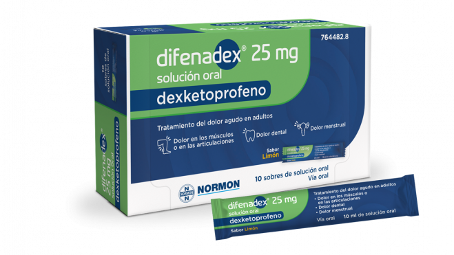 Normon S.A. ha ampliado, dentro de su división de OTC, su gama de dolor con una nueva referencia disponible en sticks. Se trata de difenadex 25 mg solución oral, 10 sobres, un medicamento sin receta para adultos indicado para el tratamiento sintomático a corto plazo del dolor agudo de intensidad leve a moderada, tal como dolor musculoesquelético, dismenorrea y odontalgia.