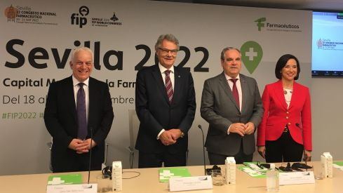 Los presidentes del Consejo General de Farmacéuticos, Jesús Aguilar; y de la Federación Internacional Farmacéutica (FIP), Dominique Jordan; han presentado hoy en Madrid, en una rueda de prensa retransmitida para todo el mundo, el 22 Congreso Nacional Farmacéutico y el 80 Congreso Mundial de Farmacia, que se celebrarán conjuntamente del 18 al 22 de septiembre de 2022 en Sevilla.