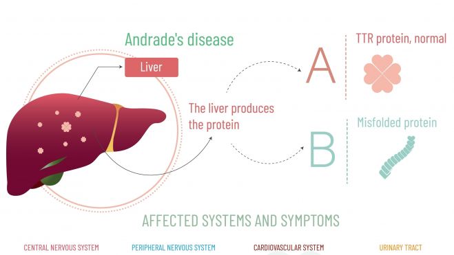 La amiloidosis por transtirretina con polineuropatía (ATTR-PN) o enfermedad de Andrade es una enfermedad poco frecuente y hereditaria, causada por mutaciones en el gen que codifica la proteína transtirretina, que se acumula afectando principalmente los nervios periféricos y, con frecuencia, el corazón y otros órganos. A nivel mundial, alrededor de 10.000 personas sufren amiloidosis hereditaria por transtirretina (AhTTR) y, en España, se estima que más de 350 personas conviven con la enfermedad, teniendo dos focos endémicos: Mallorca y Valverde del Camino (Huelva).