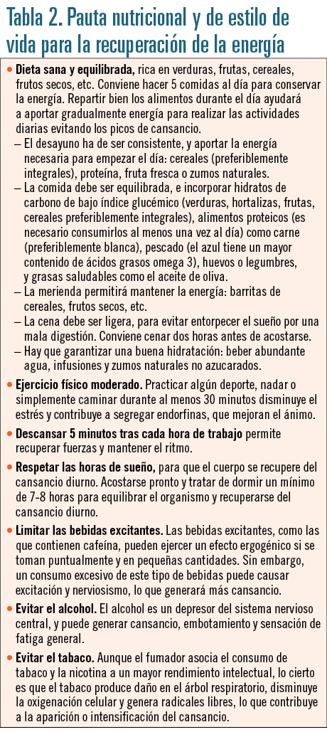 Una vez se ha descartado la presencia de síntomas de alarma o criterios de remisión al médico y se ha constatado que el cansancio puede relacionarse con situaciones transitorias de sobrecarga física o mental (tabla 1, «Causas no patológicas»), el consejo y el tratamiento deben ir encaminados a la recuperación de la energía. En primer lugar, se dará al paciente consejo nutricional y de estilo de vida destinado a corregir aquellos hábitos que puedan causar o agravar el problema, y se indicarán pautas nutricionales y de descanso que puedan mejorar la situación (tabla 2).