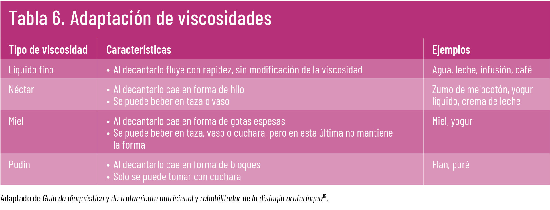 Al adaptar la consistencia de los líquidos hay que tener en cuenta el grado de disfagia de cada paciente. Para ello, en la Tabla 6 se definen los diferentes rangos de viscosidad según sus propiedades cualitativas.
