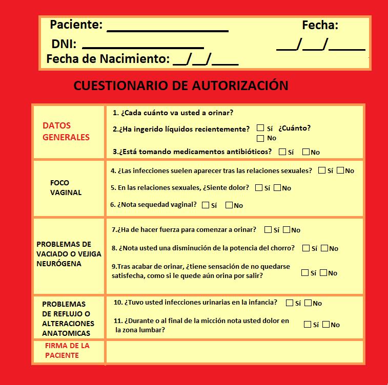 Se le proporcionará a la paciente una hoja de autorización para realizar el cribado, en la que además habrá preguntas que son necesarias para asegurarnos de que se trata, efectivamente, de una paciente diana. Esta hoja de autorización también deberá estar firmada y sellada por la oficina de farmacia que realice el servicio.
