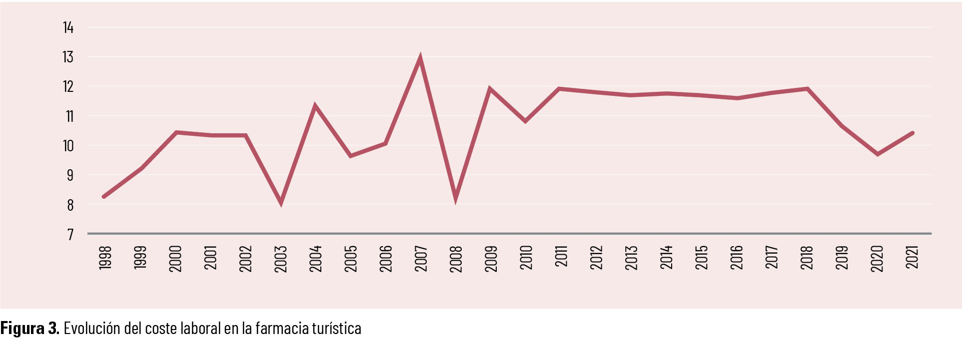 La tendencia en estos 20 años ha ido variando, siendo decreciente desde 1998 hasta 2007 e irregular hasta llegar al intervalo 2015-2019, donde el margen neto antes de impuestos ha vuelto a superar el 10 %. No obstante, en este ejercicio 2021 se aprecia un ligero aumento respecto a 2020, concretamente del 0,12 % (Figura 2).